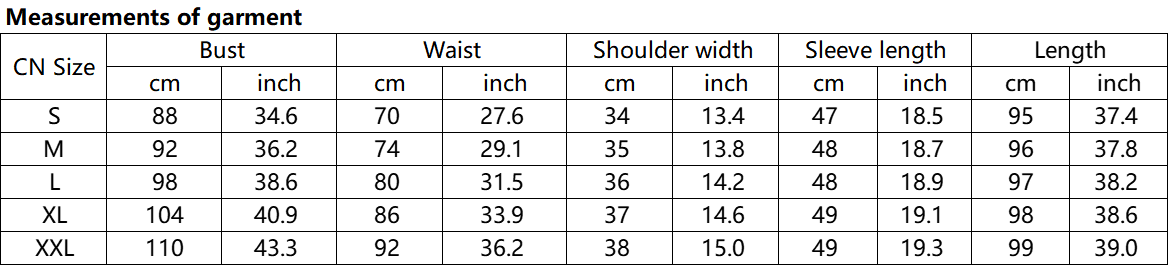 Sono disponibili 5 taglie (S/M/L/XL/XXL). Si prega di consentire differenze di 1-2 cm dovute alla misurazione manuale. Grazie per la comprensione! (Tutte le misure in cm e si prega di notare 1 cm = 0,39 pollici)