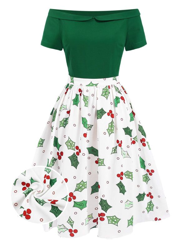 Abito patchwork natalizio con spalle scoperte verde anni '50
