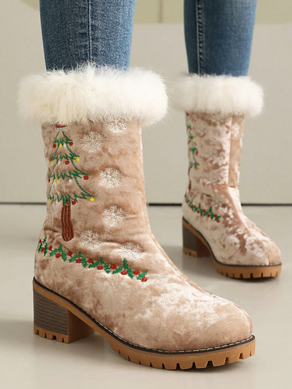 Stivali con tacco spesso in peluche a albero di Natale e fiocco di neve