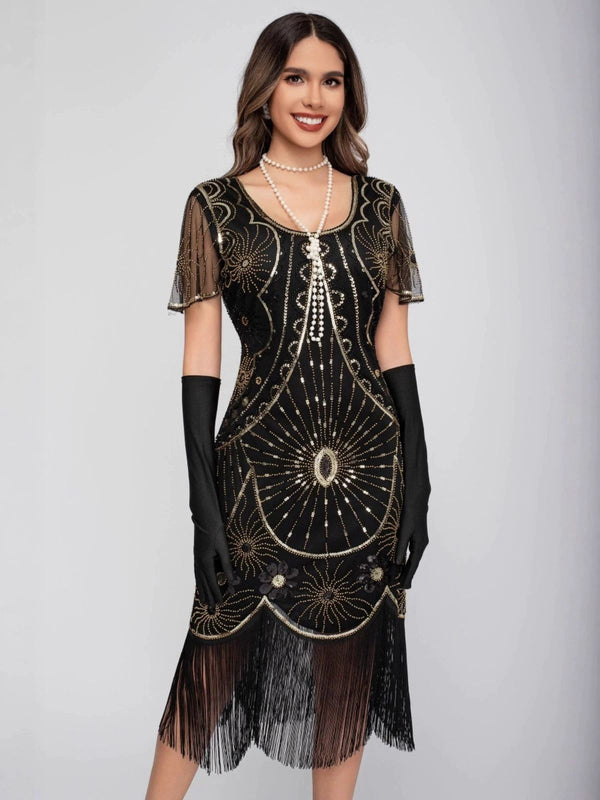 Abito flapper con frange di paillettes e scollo a barchetta anni '20