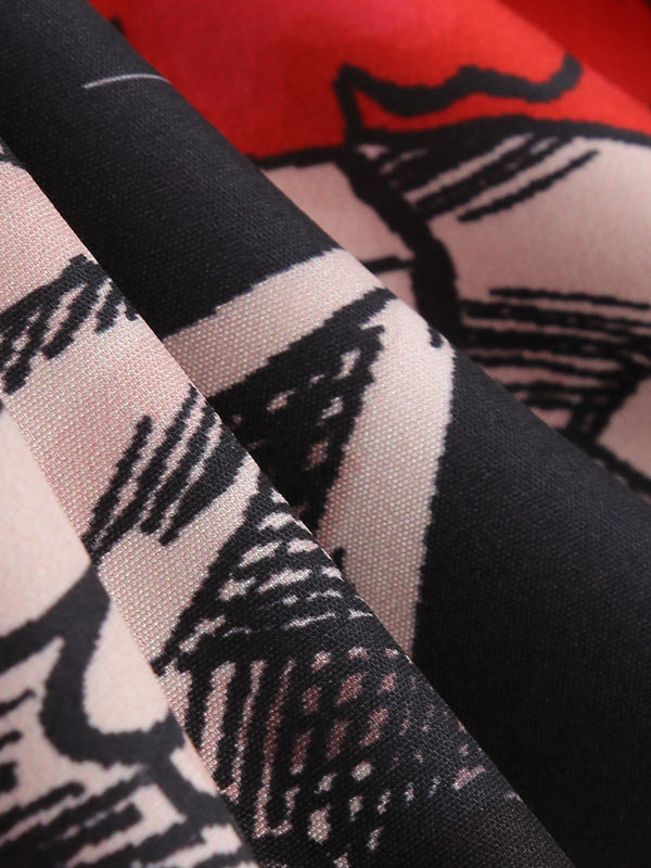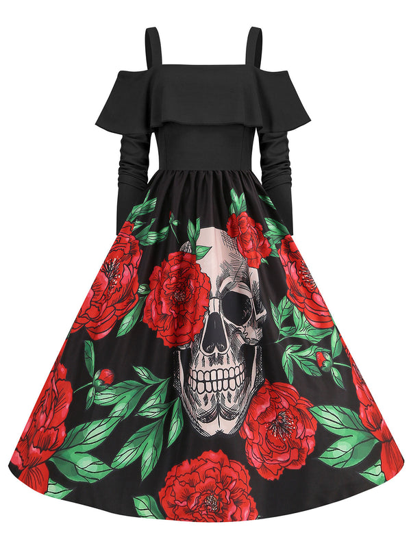 Abito con rose e teschio Halloween spalle scoperte nero anni '50