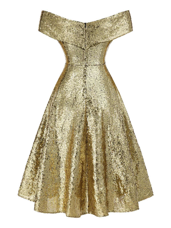 [Prevendita] Abito a ruota con paillettes e spalle scoperte oro anni '50