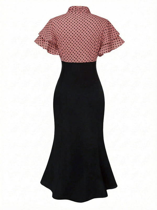 Sfoggia un fascino vintage con questo elegante abito midi a pois. Con maniche a doppio strato e orlo svasato, coniuga perfettamente il fascino retrò con l'eleganza moderna.