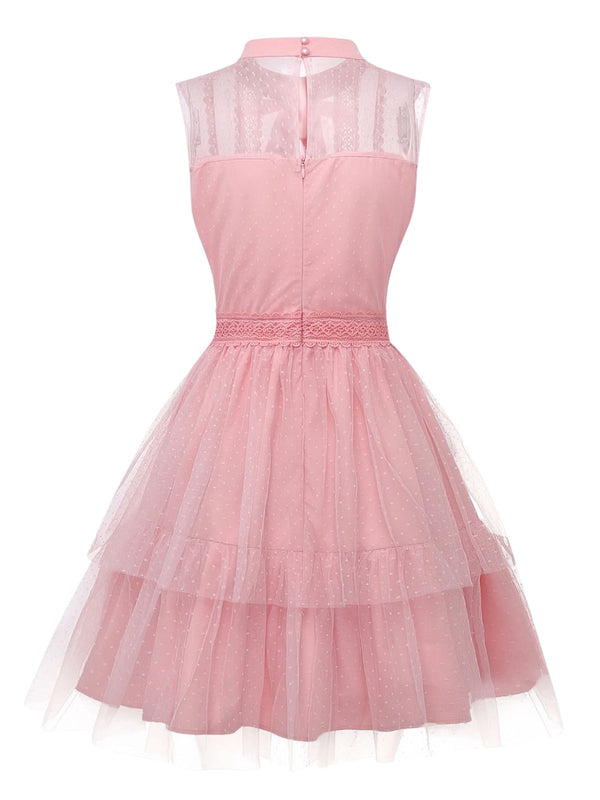 Abito in tulle senza maniche con fiocco in pizzo rosa anni '60