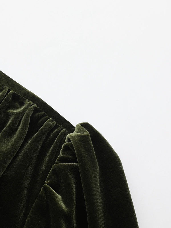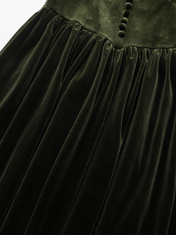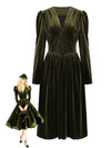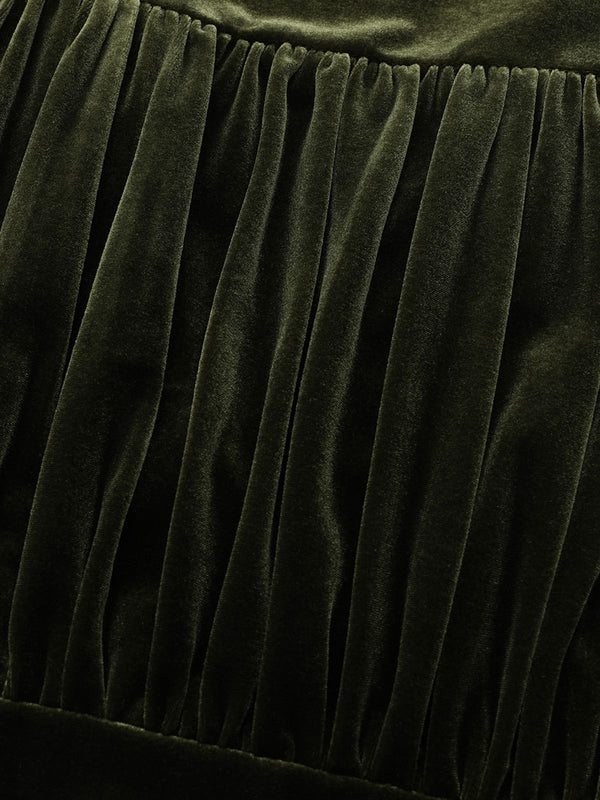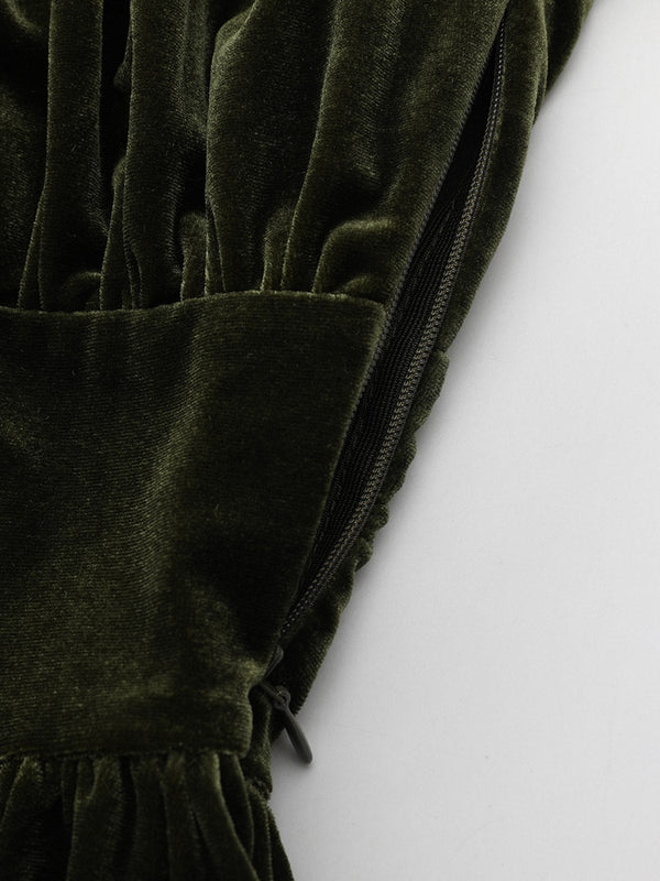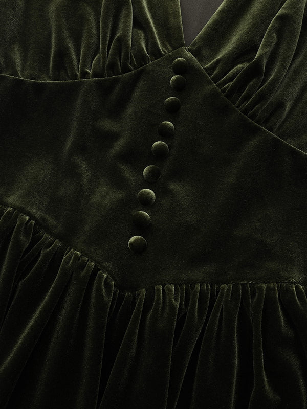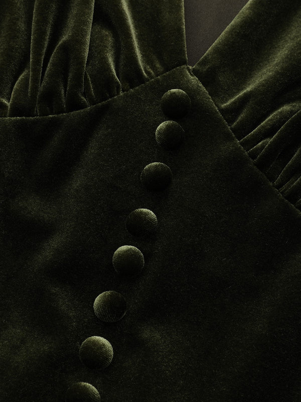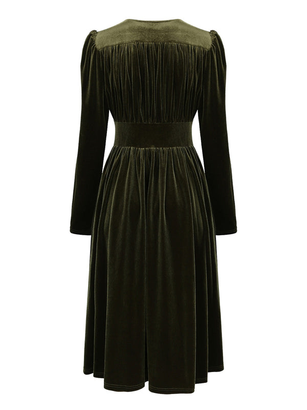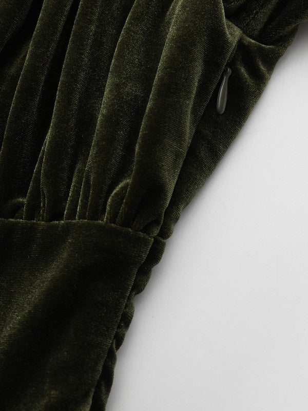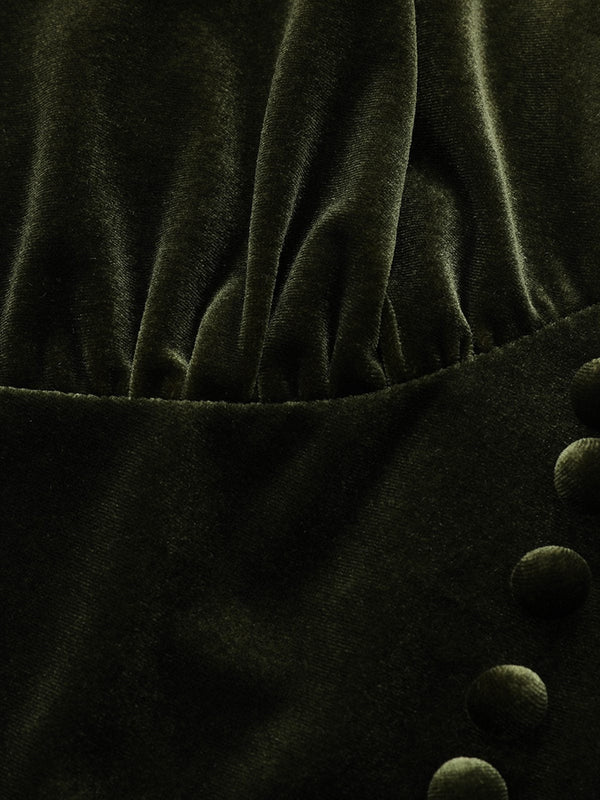 Abito in velluto con scollo a V profondo arricciate verde anni '40