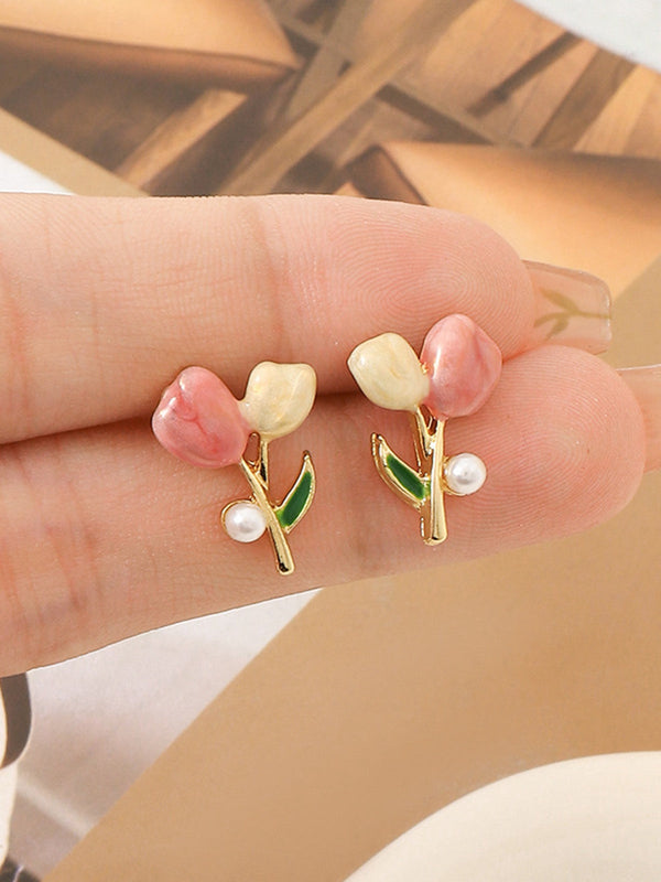 Orecchini a bottone con perle e fiori di tulipano rosa
