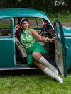 2PCS Top floreale scollo a cravatta e gonna bottoni verde anni '60