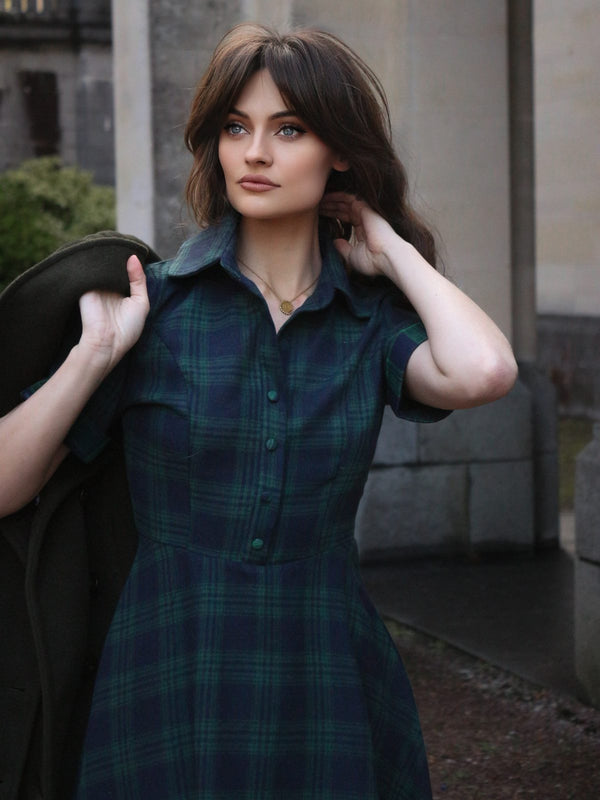Trasformate la vita in un picnic, signore! L'abito presenta un classico motivo scozzese verde su uno sfondo blu navy in un meraviglioso tessuto elasticizzato. Infine, un vestito che incapsula lo stile vintage supremo che stavi sognando e un vestito che è così autenticamente vintage che è come riportare indietro l'orologio alla metà del 50esimo secolo...