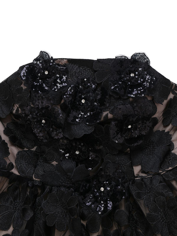 Abito a fascia floreale 3D in rete con patchwork nero anni '50