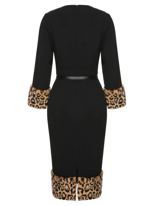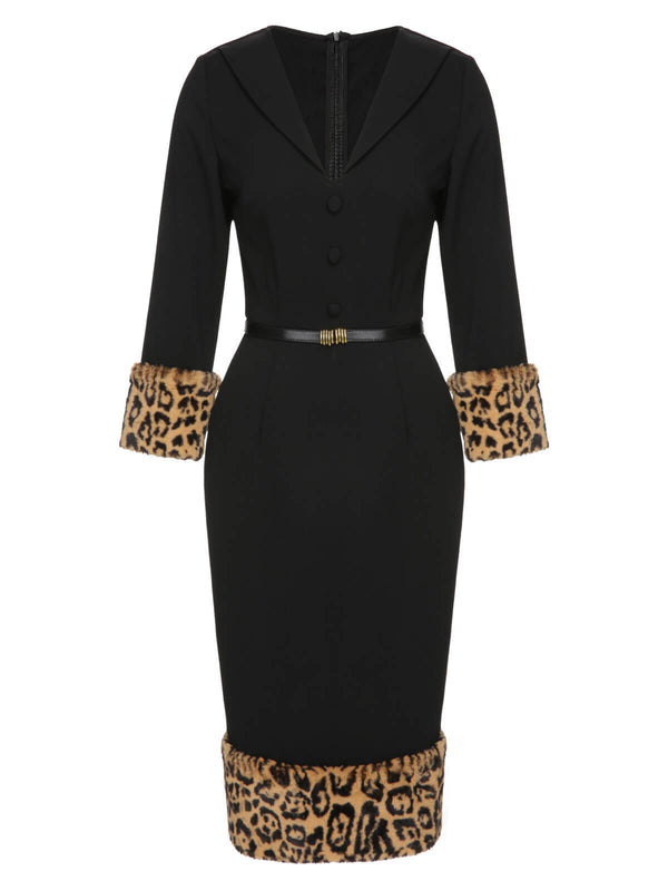 Abito a tubino leopardato in peluche nero anni '60