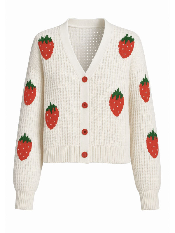 Cardigan in maglia con spalle cadenti e fragole beige anni '50