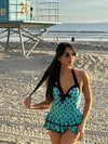 Un fiocco giocoso sul davanti aggiunge un tocco di fantasia, mentre le delicate arricciature lungo il corpetto valorizzano la tua figura. Il design a vita alta offre una copertura totale, garantendo comfort senza rinunciare allo stile. Abbinalo a un cappello a tesa larga e occhiali da sole a occhi di gatto per un look davvero glamour.